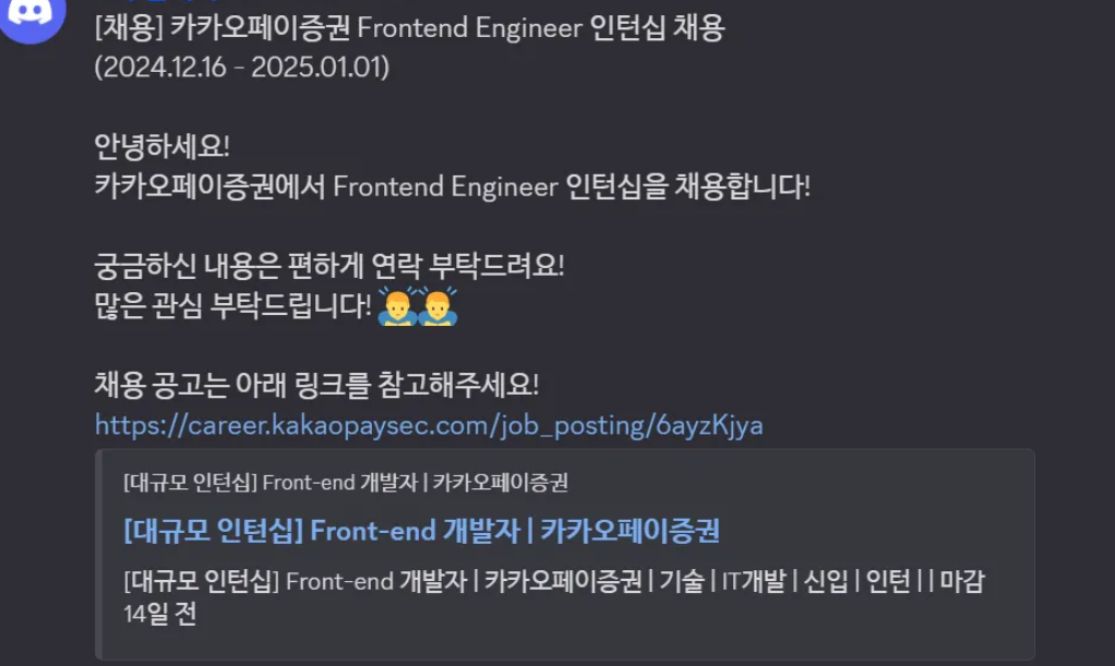 이력서를 다 개선할 즈음 카카오페이증권 대규모 인턴십 공고를 보게 되었다. 채용 한파로 프론트엔드 채용 공고를 보기 힘든 시기여서 반가운 마음에 채용 공고를 읽어보았다.