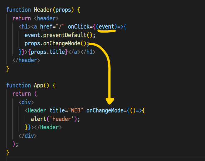 onClick()에 callback 함수로 들어간 함수가 호출될 때, 리액트는 event객체를 첫번째 파라미터로 주입해준다.